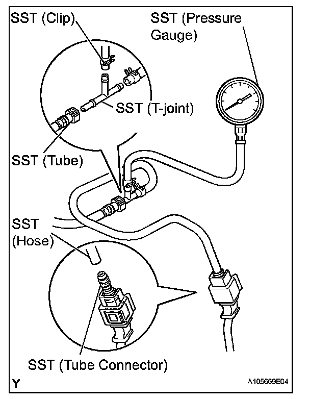 e. Install SST (pressure gauge) and the fuel tube connector using SST as shown in the illustration.
