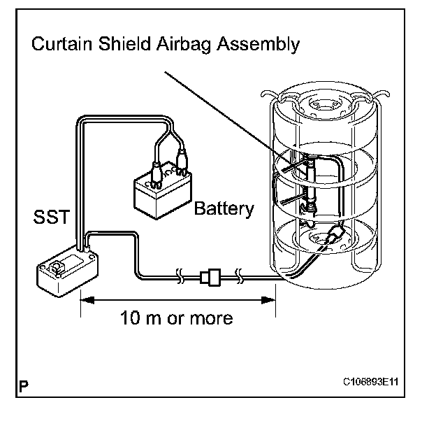 HINT: When scrapping a vehicle equipped with the SRS or disposing of the curtain shield airbag assembly, be sure to deploy the airbag first in accordance with the procedure described below. If any abnormality occurs with the airbag deployment, contact the SERVICE DEPT. of TOYOTA MOTOR SALES, U.S.A., INC.