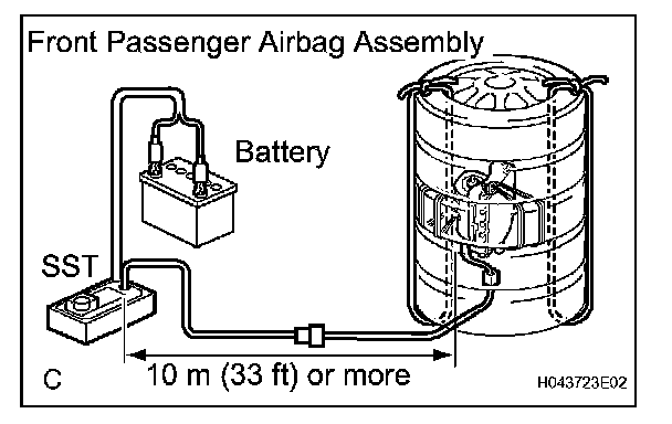 - When deploying the airbag, perform the operation at least 10 m (33 ft) away from the front passenger airbag assembly.