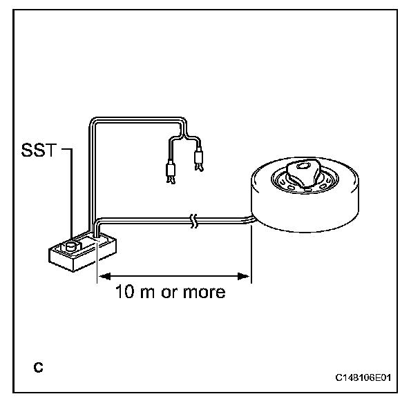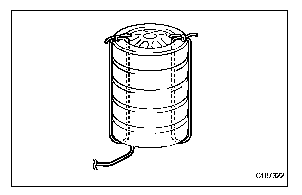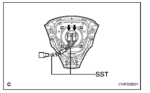 3. Face the airbag deployment side of the steering pad upward. Separately tie the left and right sides of the steering pad to the disc wheel through the hub nut holes. Position the SST connector so that it hangs downward through the hub hole of the disc wheel.