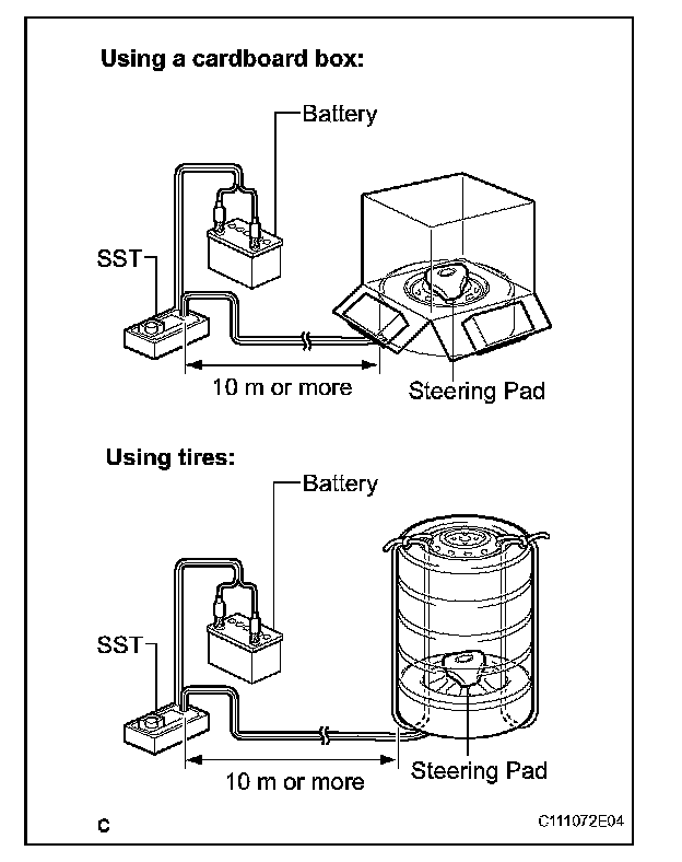HINT: When scrapping a vehicle equipped with the SRS or disposing of the steering pad, be sure to deploy the airbag first in accordance with the procedure described below. If any abnormality occurs with the airbag deployment, contact the SERVICE DEPT. of TOYOTA MOTOR SALES, U.S.A., INC.