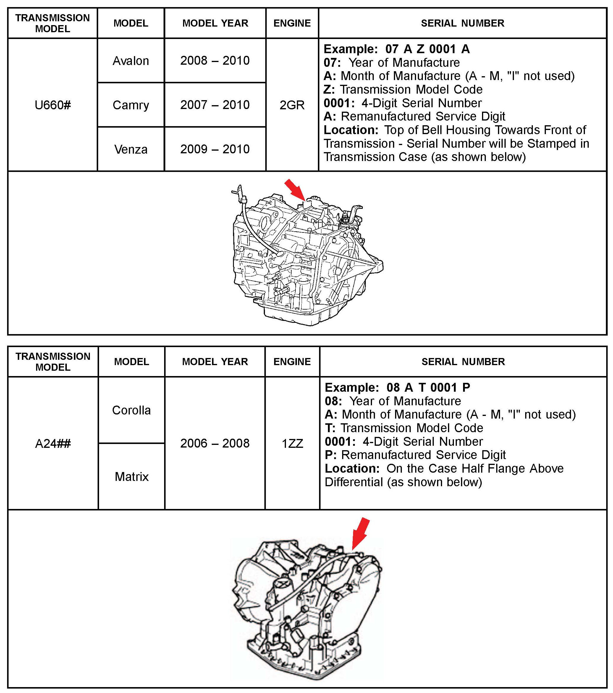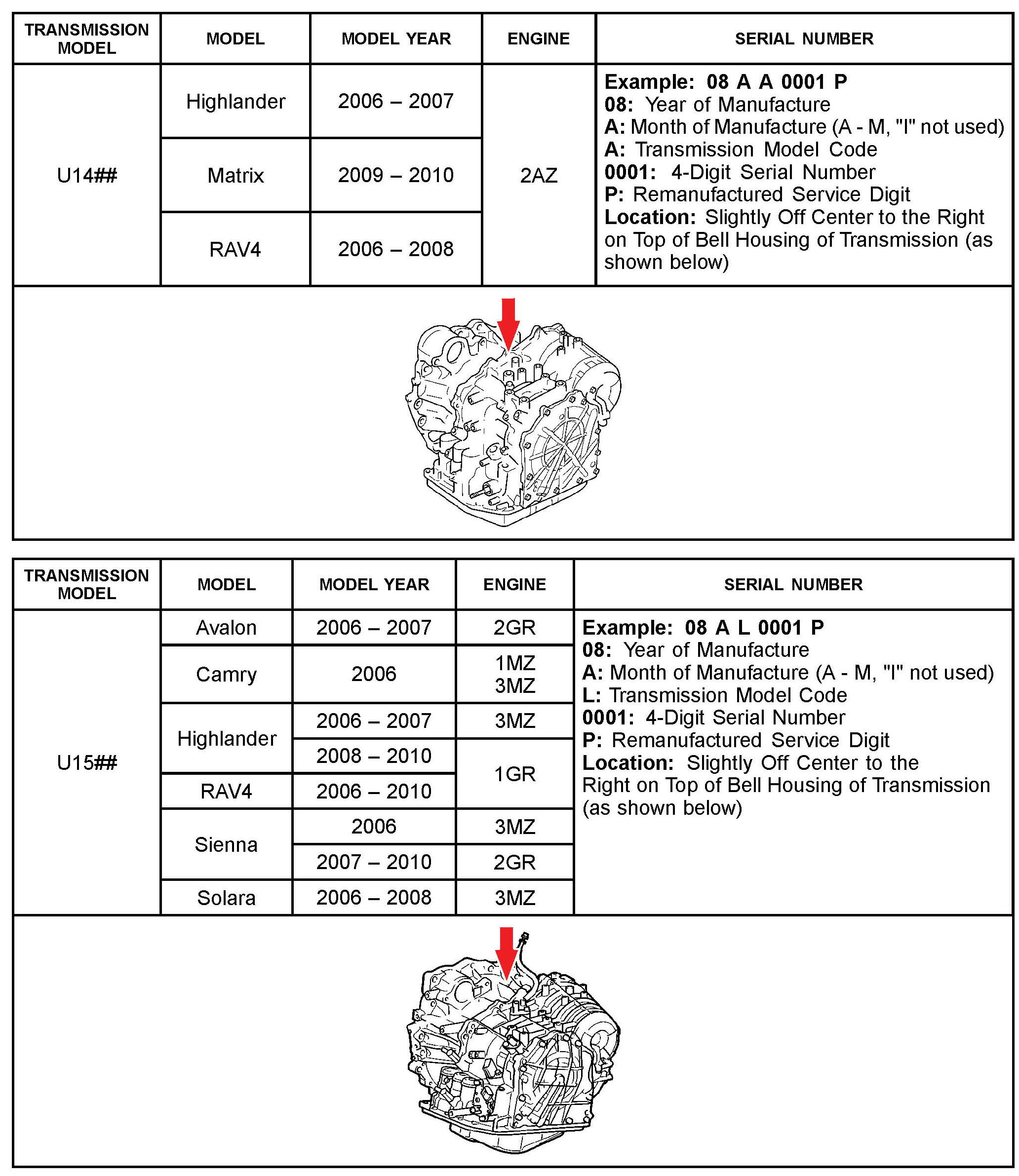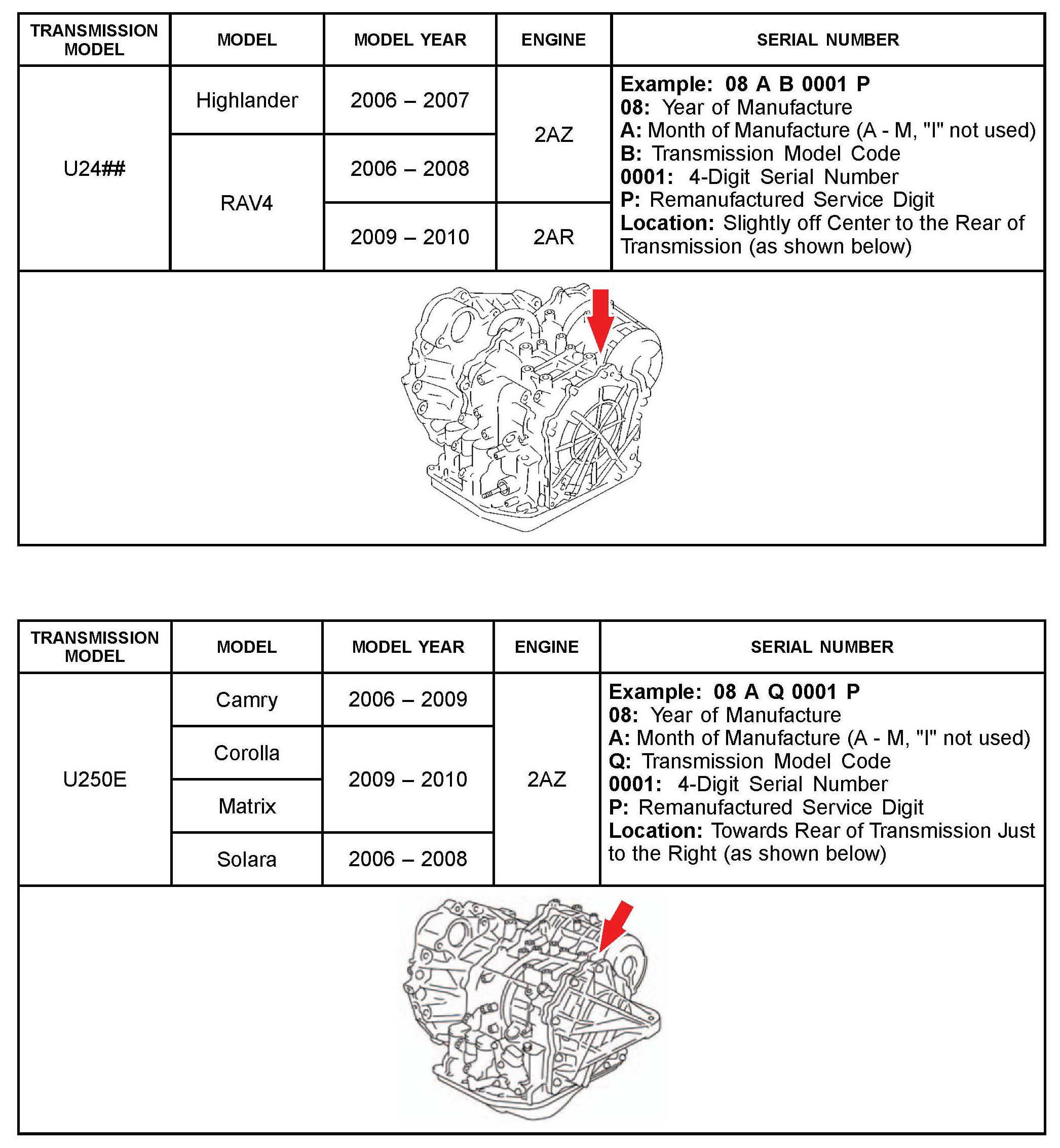The purpose of this TSB is to assist in the identification and location of serial numbers on 2006 - 2010 model year remanufactured automatic transmissions.