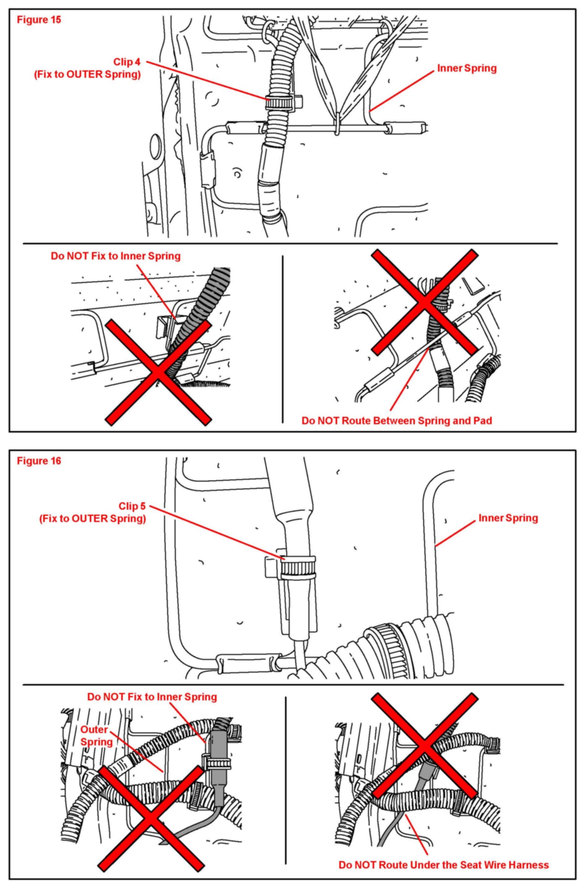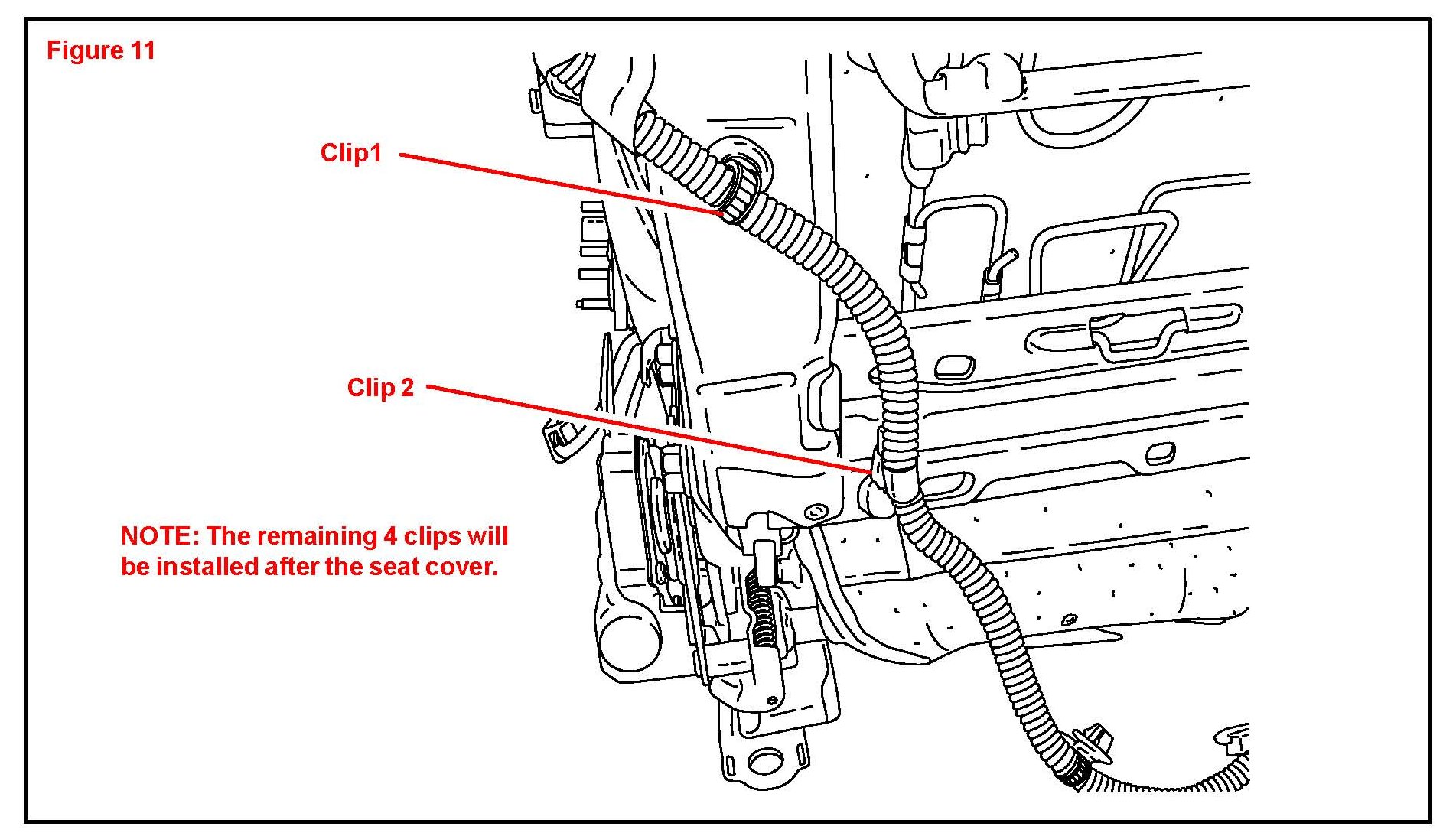 15. Install the remaining 4 clips to the seat frame bottom using the diagrams below.
