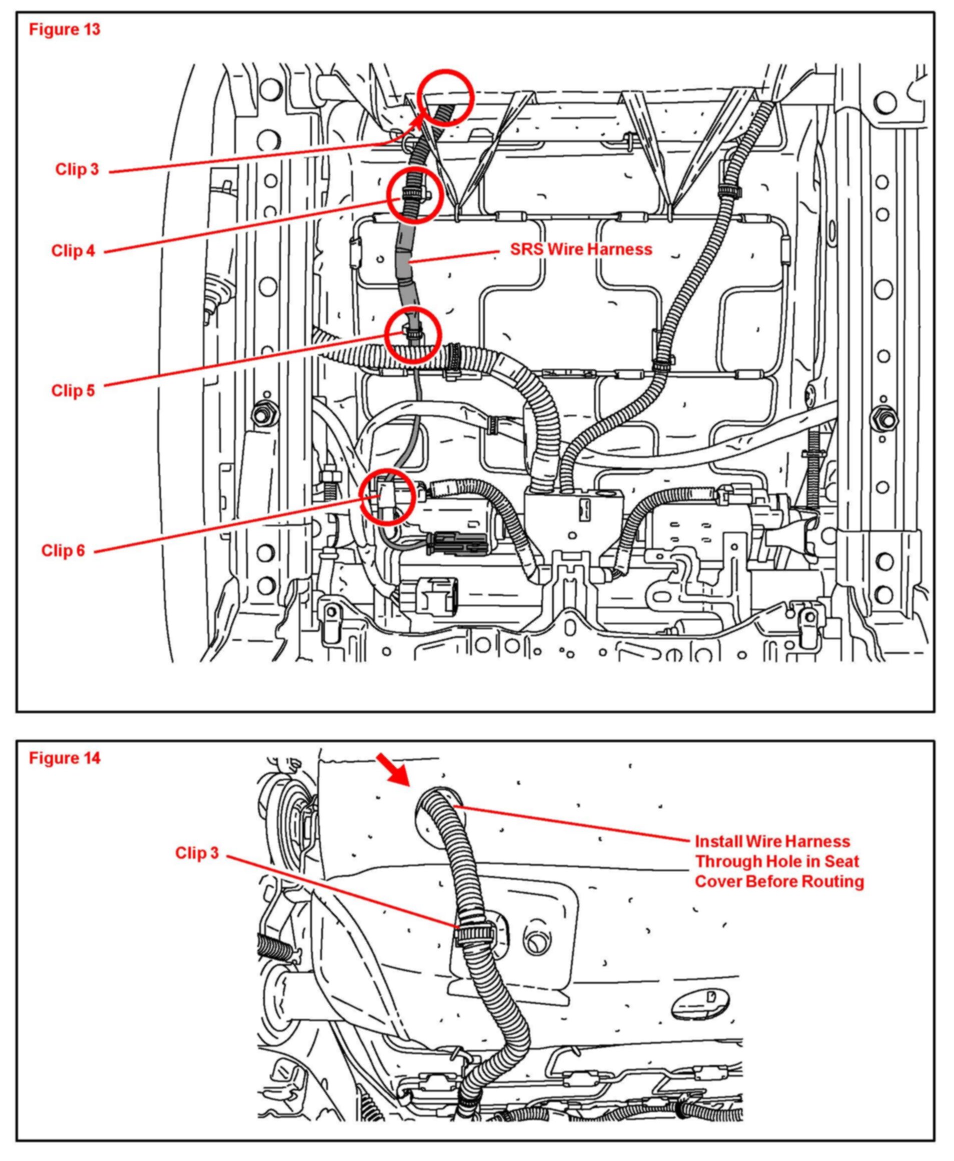 10. Disconnect the 4 clips securing the SRS harness from the bottom of the seat.