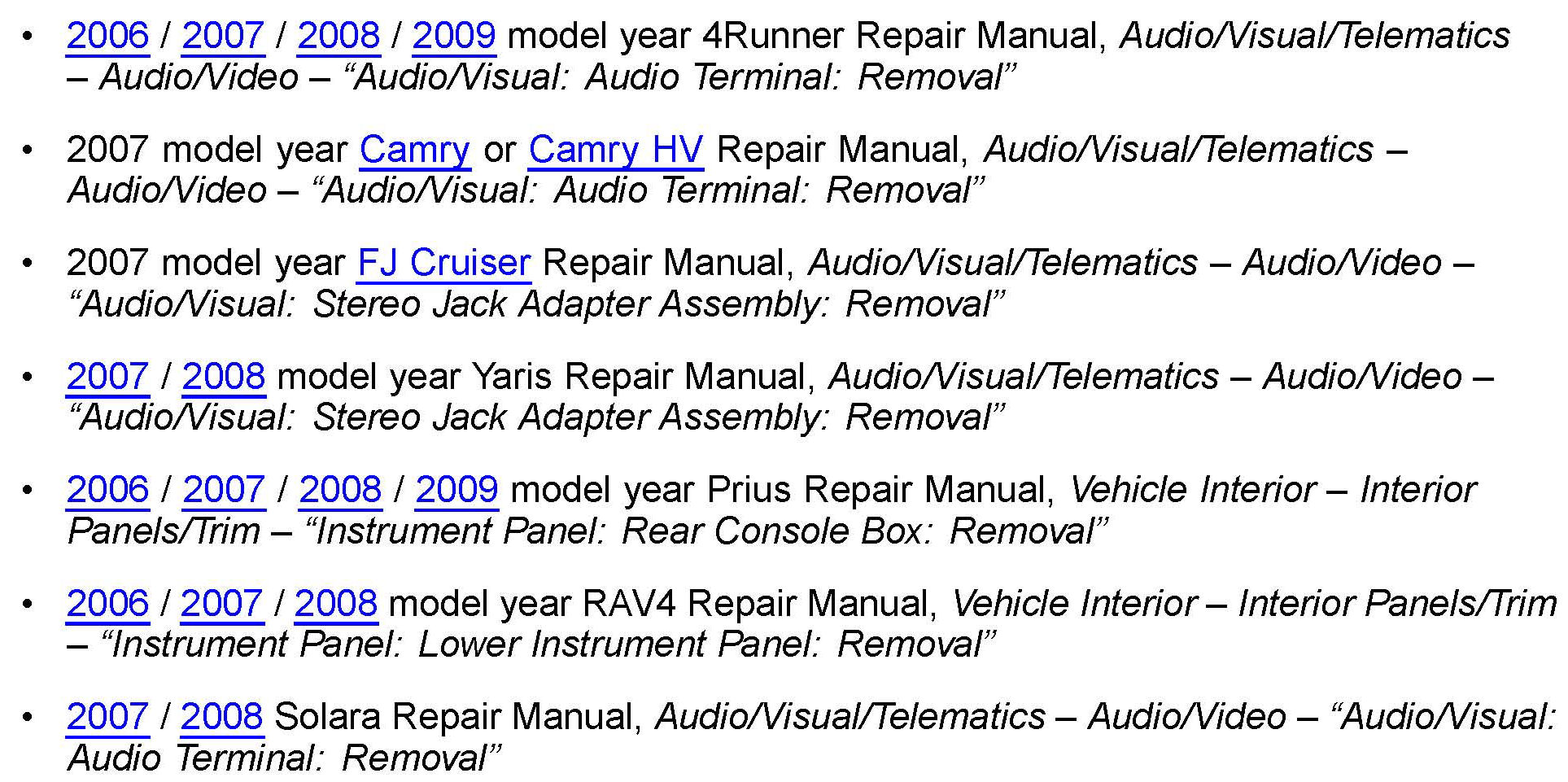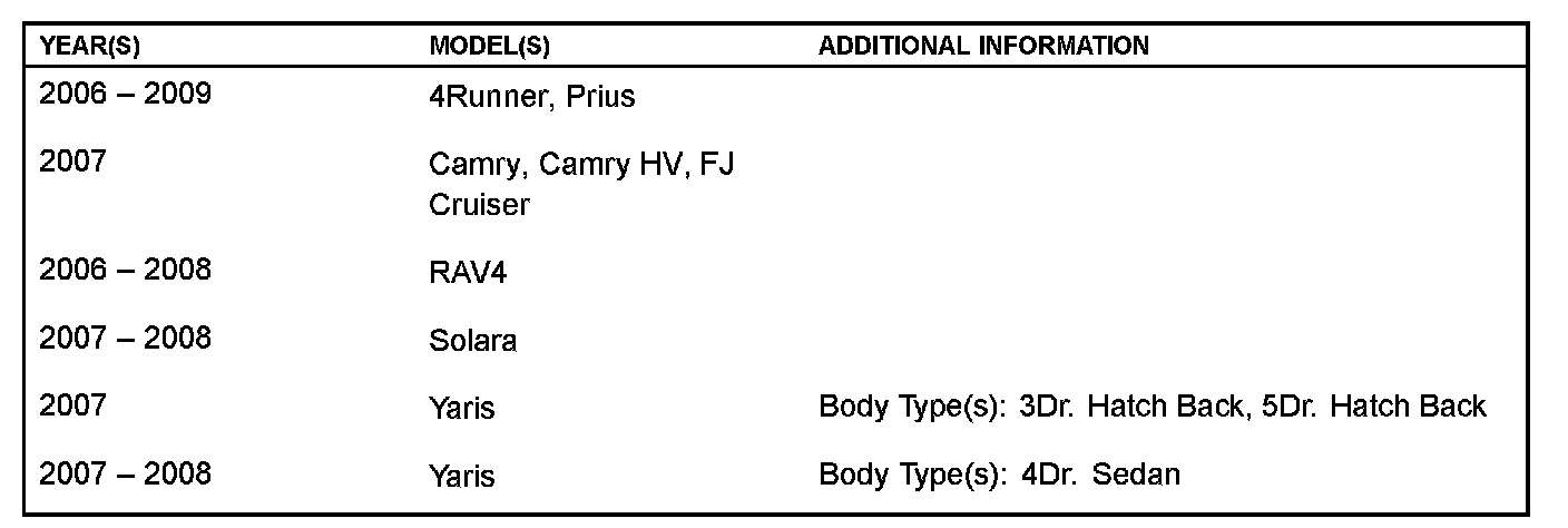 Applicability has been updated to include 2009 model year 4Runnei; Pri us, and 2008 model year Yaris Sedan.