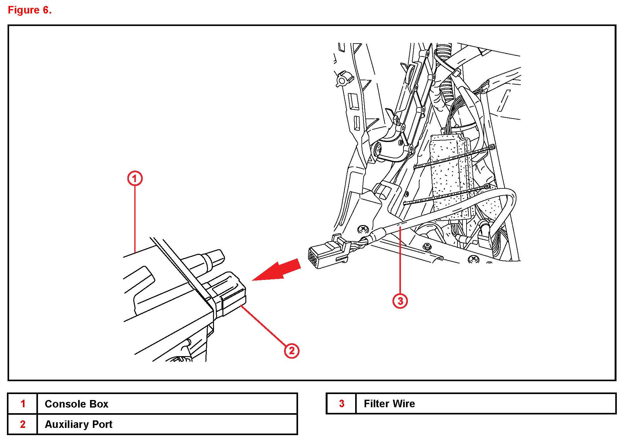 Some customers may notice noise in the auxiliary mode of their audio system when using an MP3 player or other external audio source with a charger connected to the 12V power port of the vehicle. An improved auxiliary port and in-line filter has been developed to improve this condition. Use the repair procedure below to install the new in-line filter and auxiliary port.