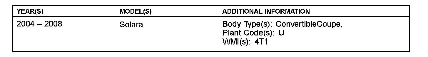 Some customers of 2004 - 2008 model year Solara vehicles may complain of the A-pillar garnish coming loose. Improved A-pillar garnish headliner and C-pillar garnish have been developed to improve this condition.