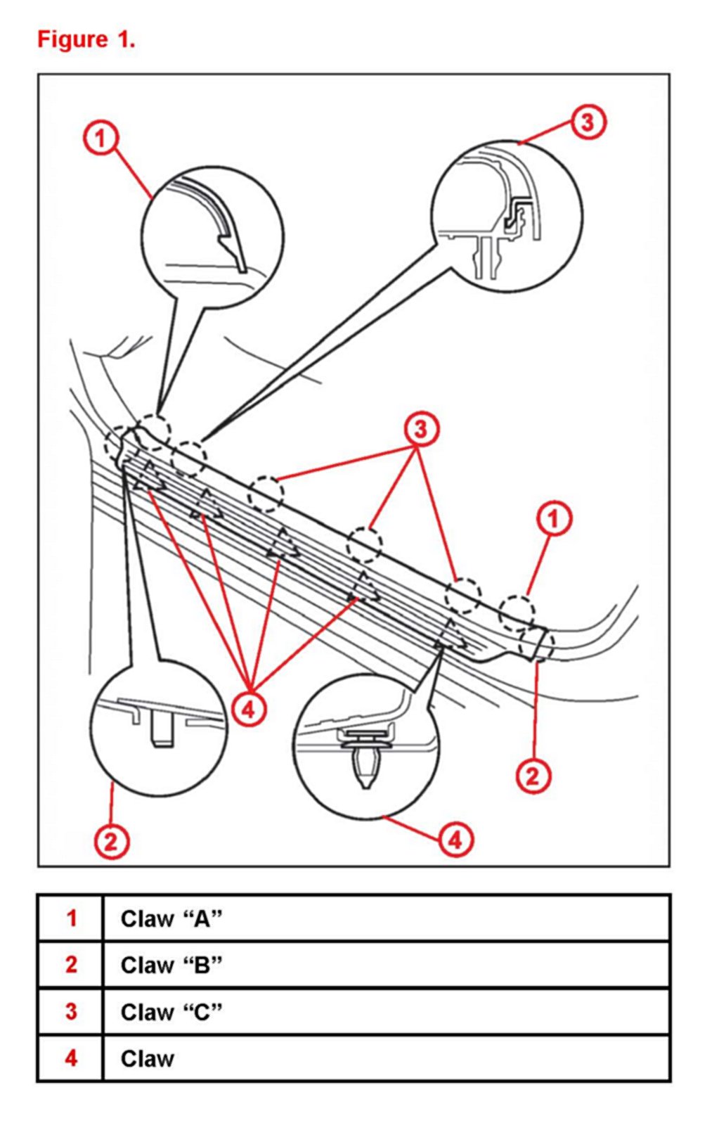 A. Using the plastic pry tool disengage the 2 claws labeled A, 2 claws labeled B, 4 claws labeled C.