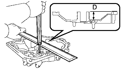 (d) As shown in the illustration, place a straight edge on the direct clutch drum and measure the distance between transaxle case and the straight edge using vernier calipers (Dimension C).