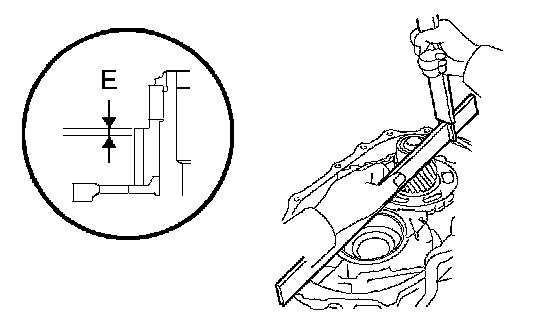 (d) Using a straight edge and vernier calipers as shown in the illustration, measure the gap between the top of the differential drive pinion in the underdrive planetary gear and contact surface of the transaxle case and housing (Dimension E).