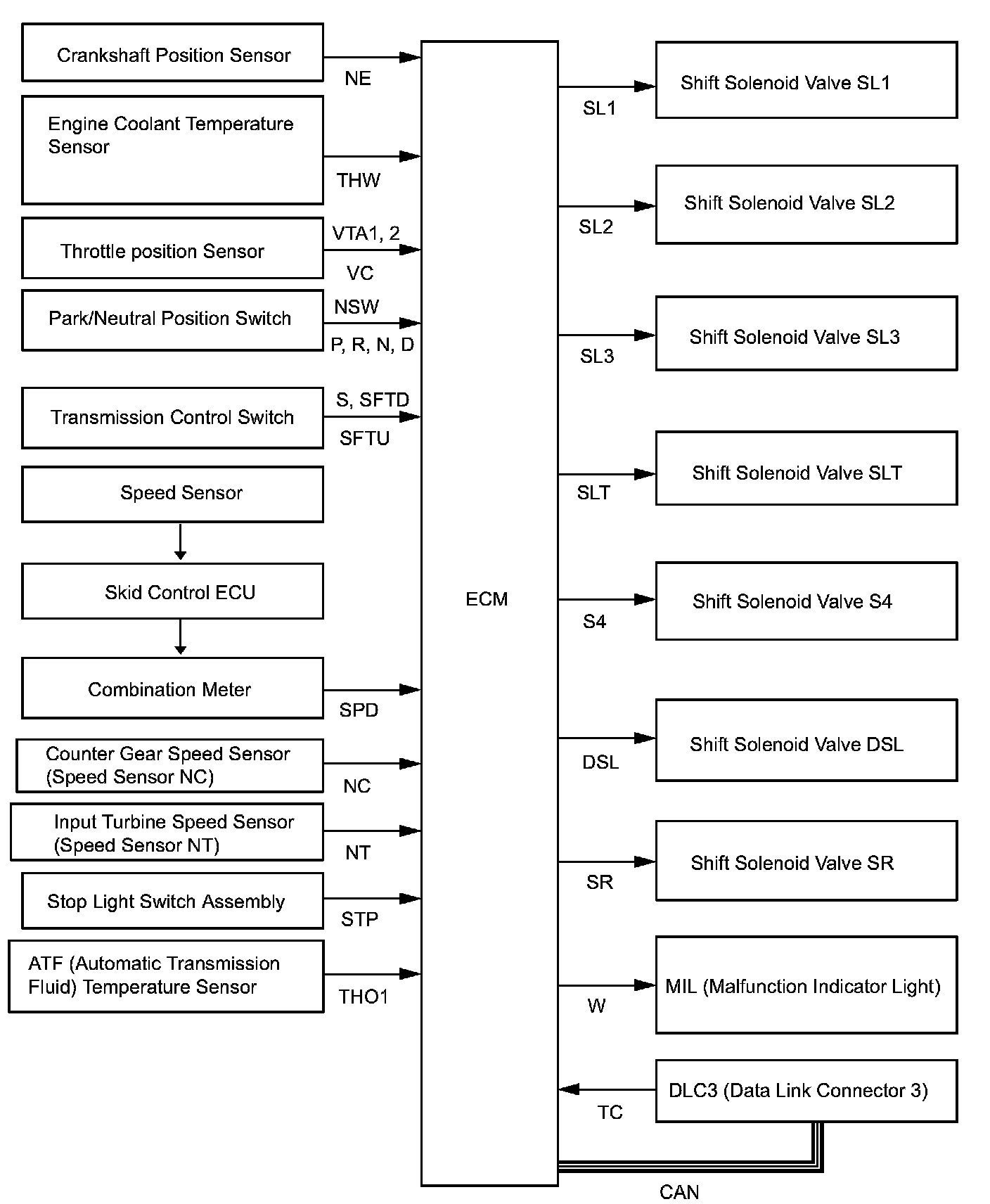 SYSTEM DIAGRAMThe configuration of the electronic control system in the U151E automatic transaxle is as shown in the chart.