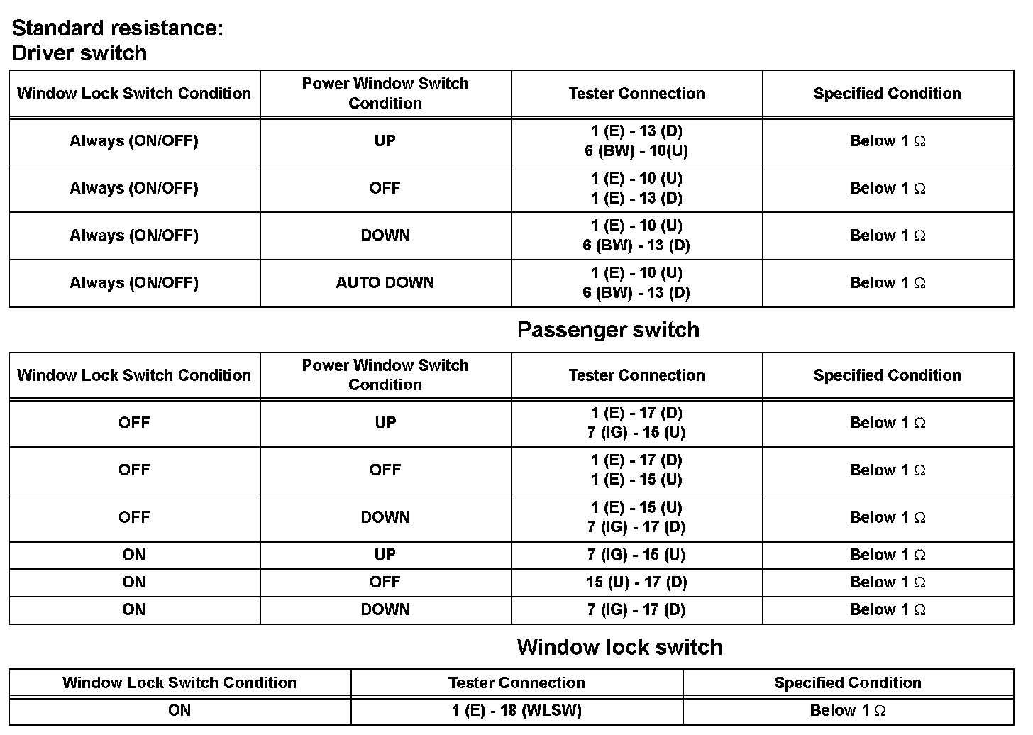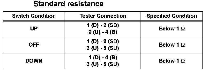 If the result is not as specified, replace the master switch assembly.