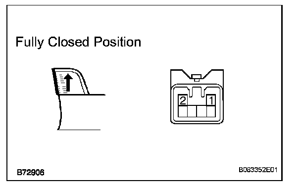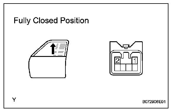 3. Connect the battery's positive (+) lead to terminal 1 of the wire harness side connector, and raise the window to the fully closed position. 4.Continue to apply voltage, and check that the current changes to less than 1 A within 4 to 90 seconds.