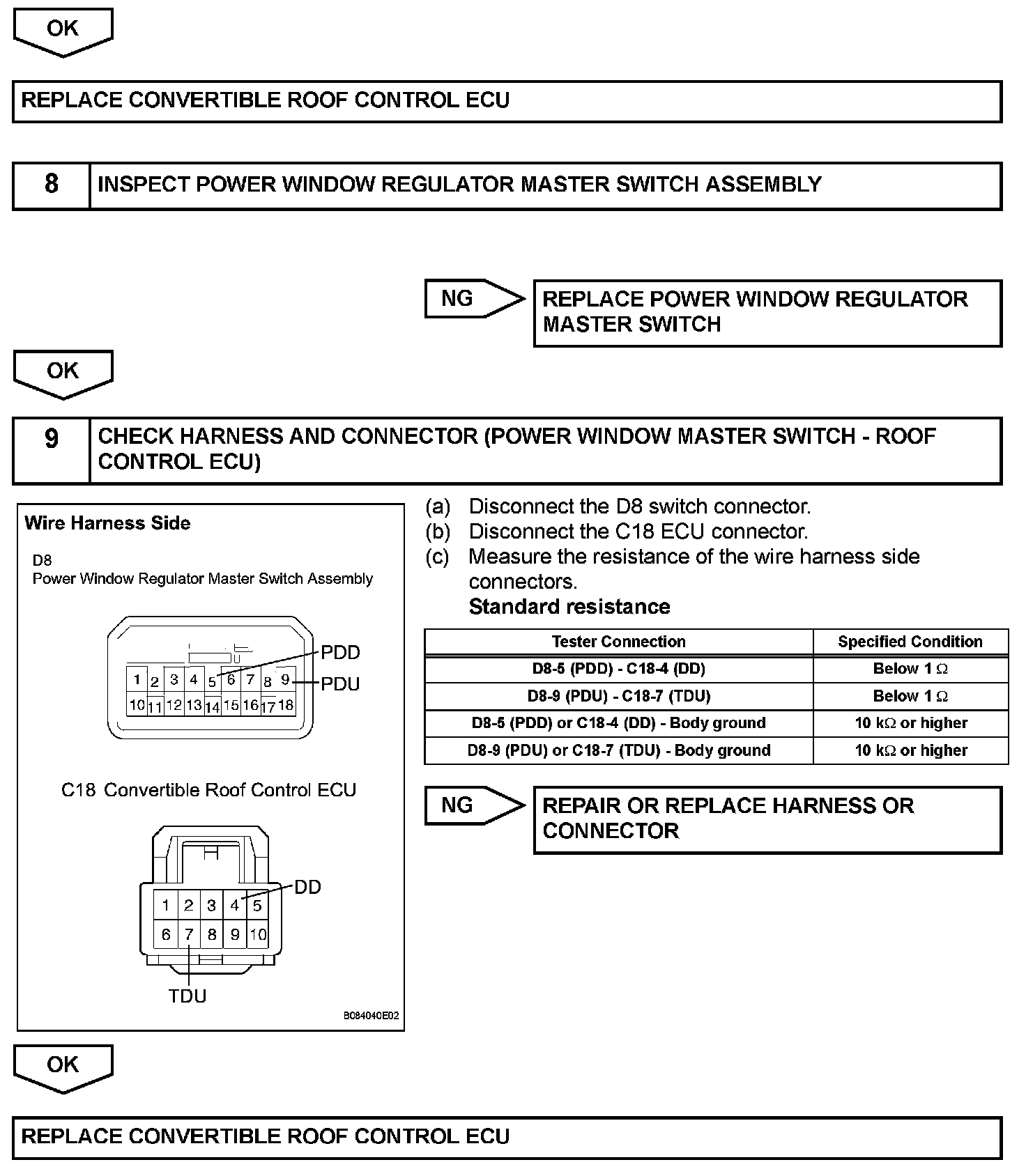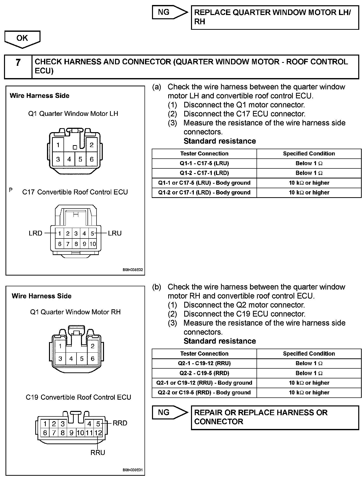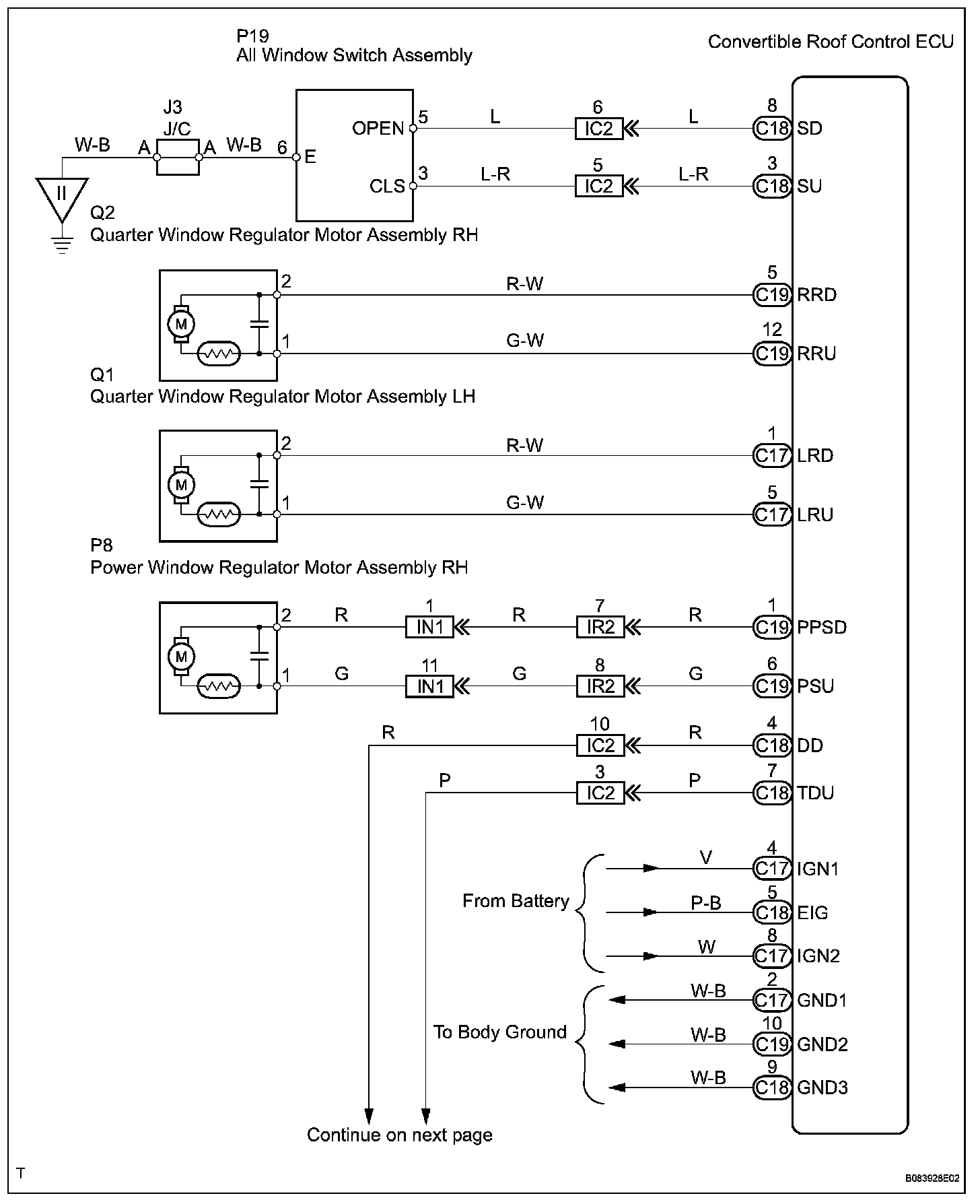 The all window switch can operate all the power windows. The all window switch outputs signals to the convertible roof control ECU which activates the passenger, quarter LH/RH window regulator motors directly. For the driver window regulator motor, the convertible control ECU outputs signals to the master switch, and the master switch activates the driver window regulator motor.
