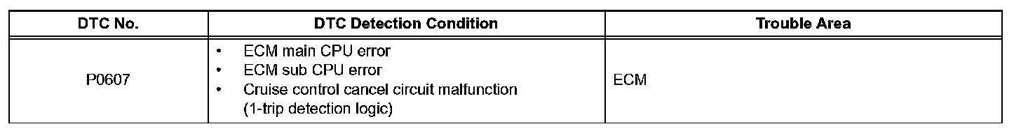 The ECM also monitors the cruise control cancel circuit. If this circuit malfunctions, the ECM will set a DTC immediately (MIL is not illuminated).