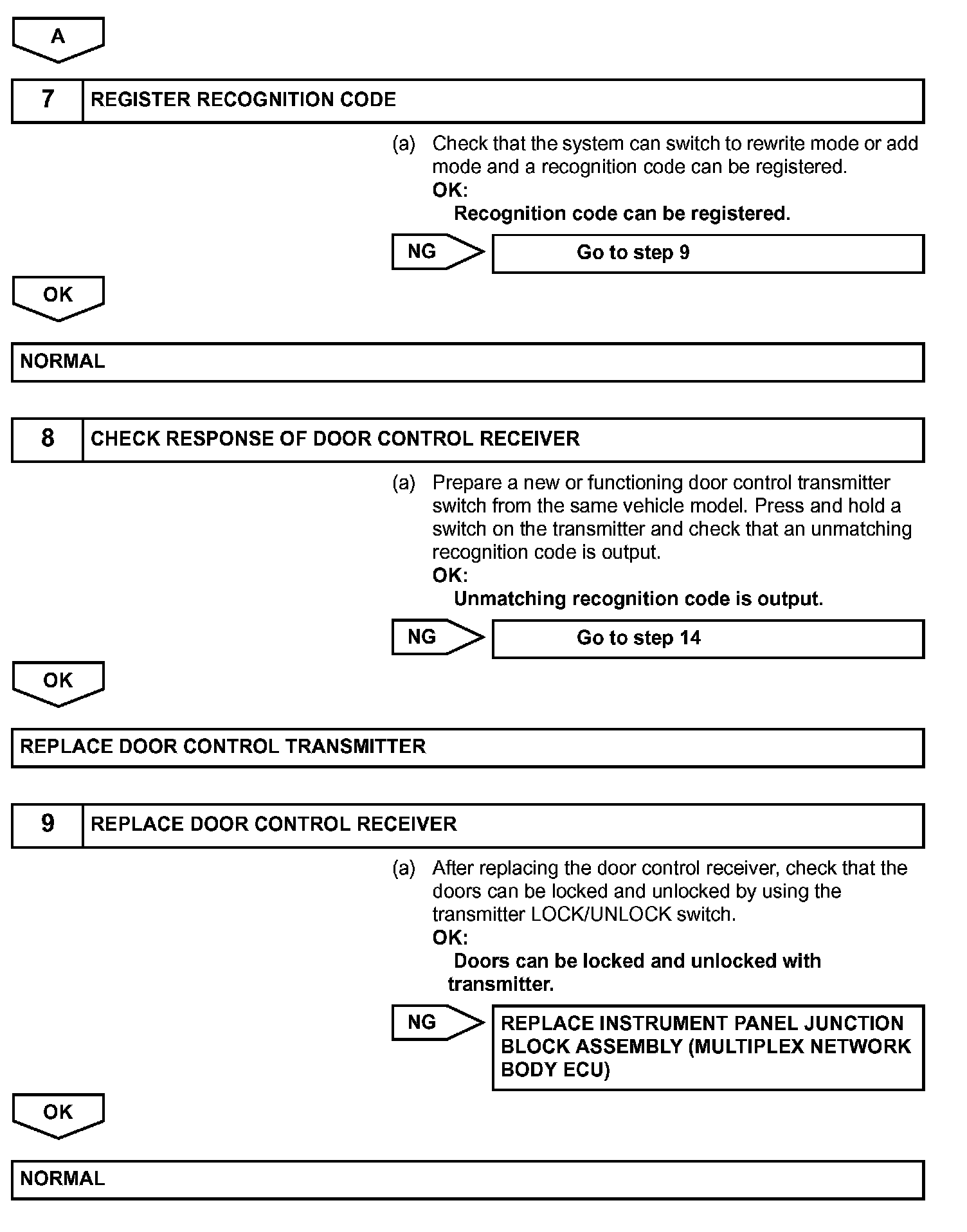 The door control receiver receives signals from the transmitter and sends these signals to the multiplex network body ECU. The multiplex network body ECU then controls all the doors by sending LOCK/ UNLOCK signals to each door lock actuator, buzzer signals to the wireless door lock buzzer and headlight/taillight and hazard warning signals to the turn signal flasher relay.