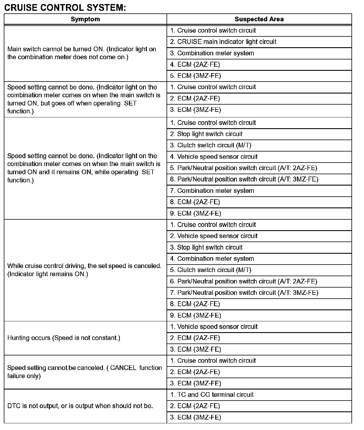 If a normal code is displayed while checking DTCs but the problem still occurs, check the circuits for each problem symptom in the order given in the table and proceed to the relevant troubleshooting.