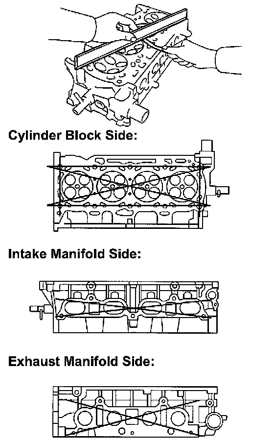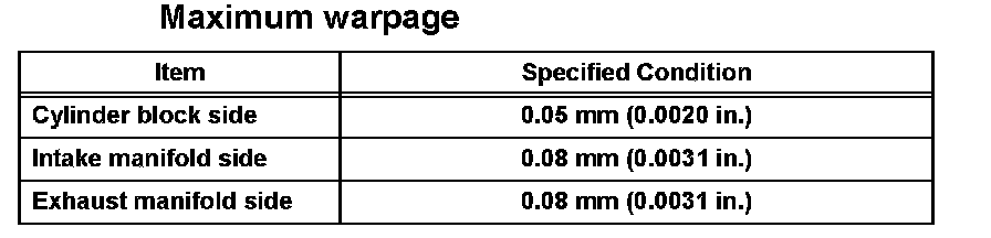 Using a precision straight edge and a feeler gauge, measure the surface contacting the cylinder block and the manifolds for warpage.
