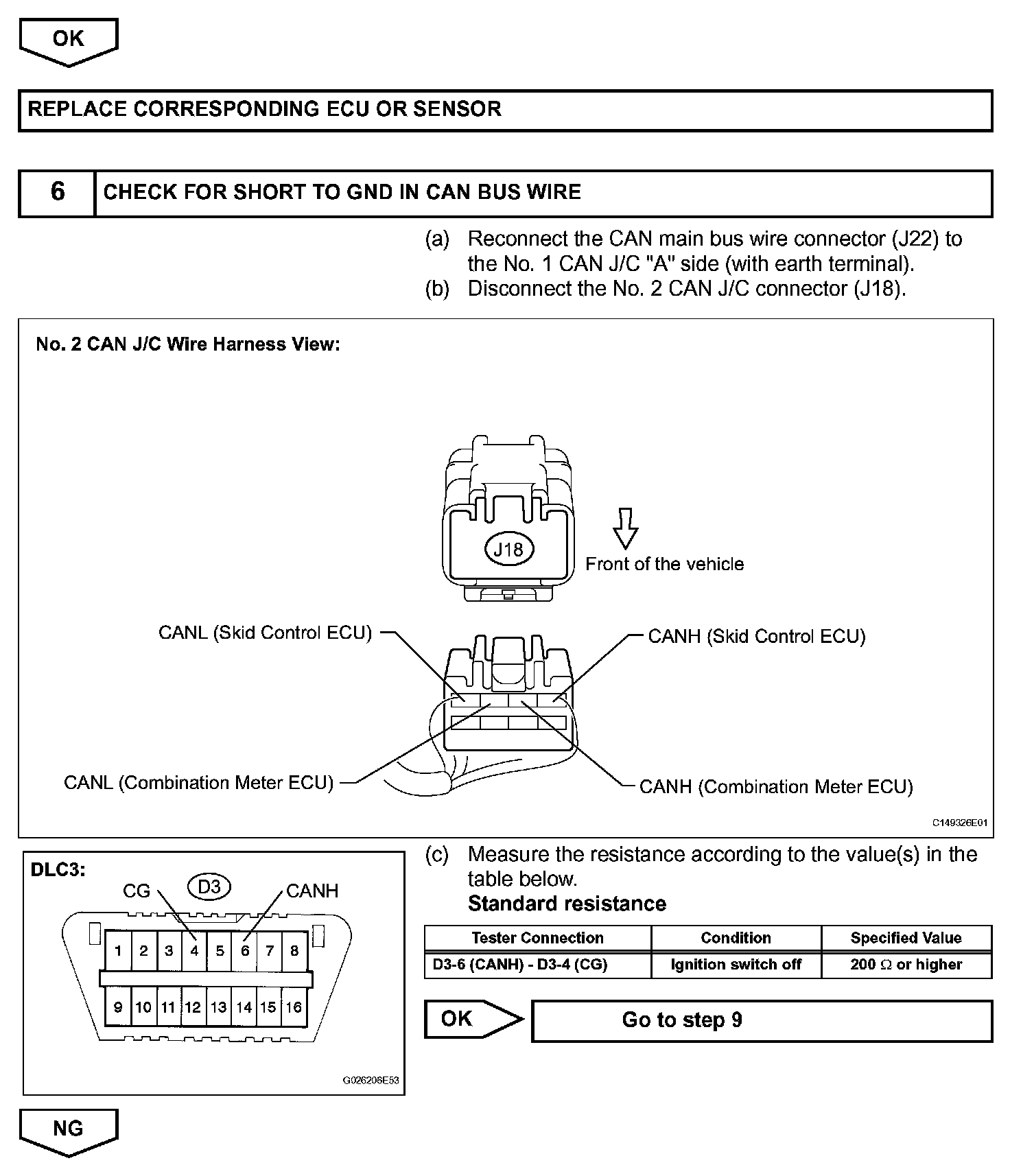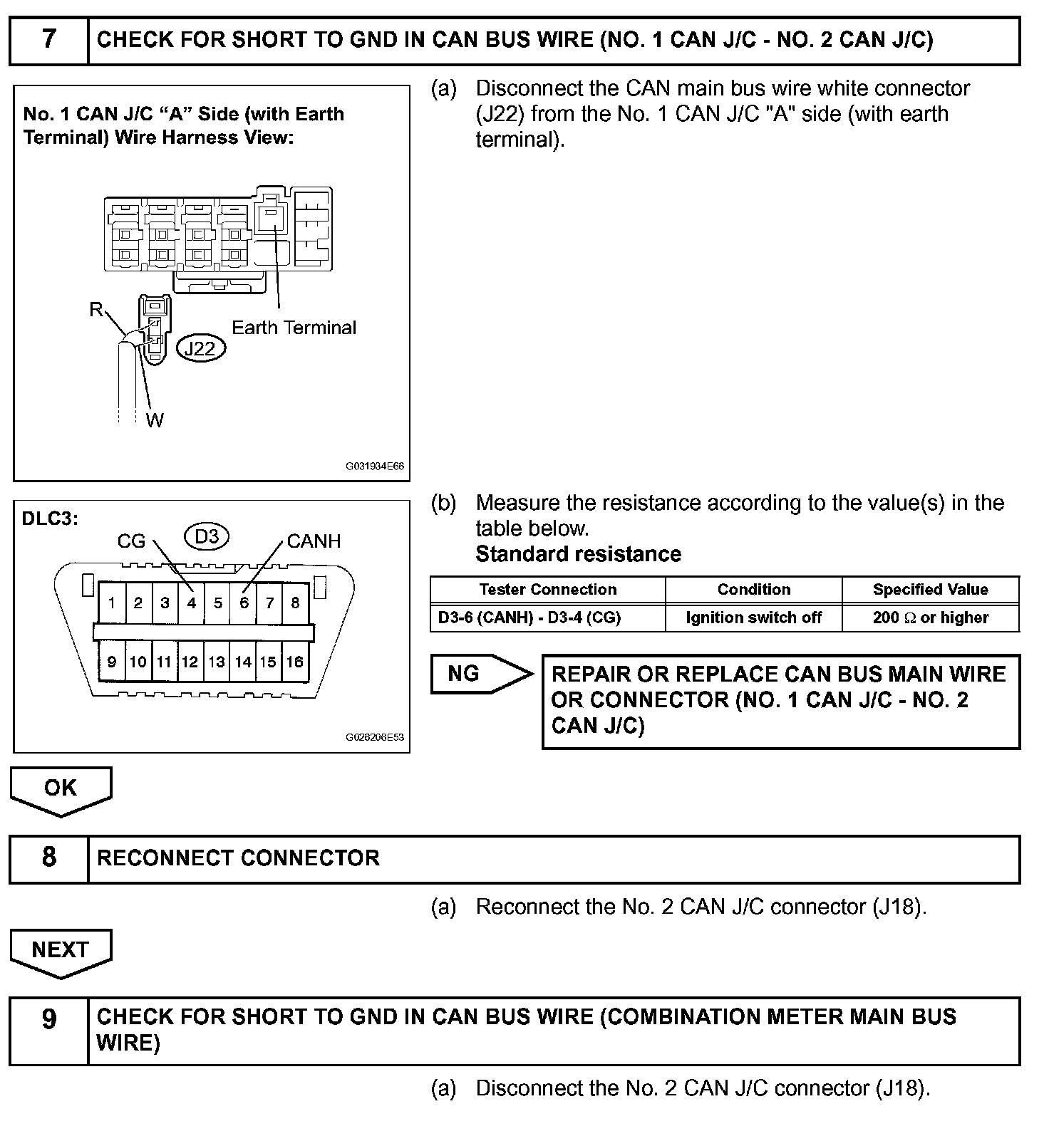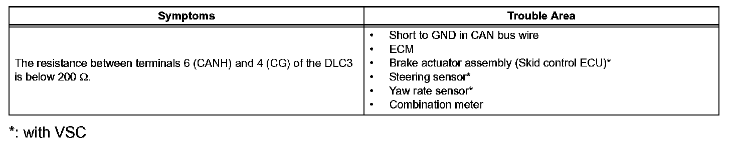 A short to GND is suspected in the CAN bus wire when the resistance between terminals 4 (CG) and 6 (CANH) of the DLC3 is below 200 ohms.