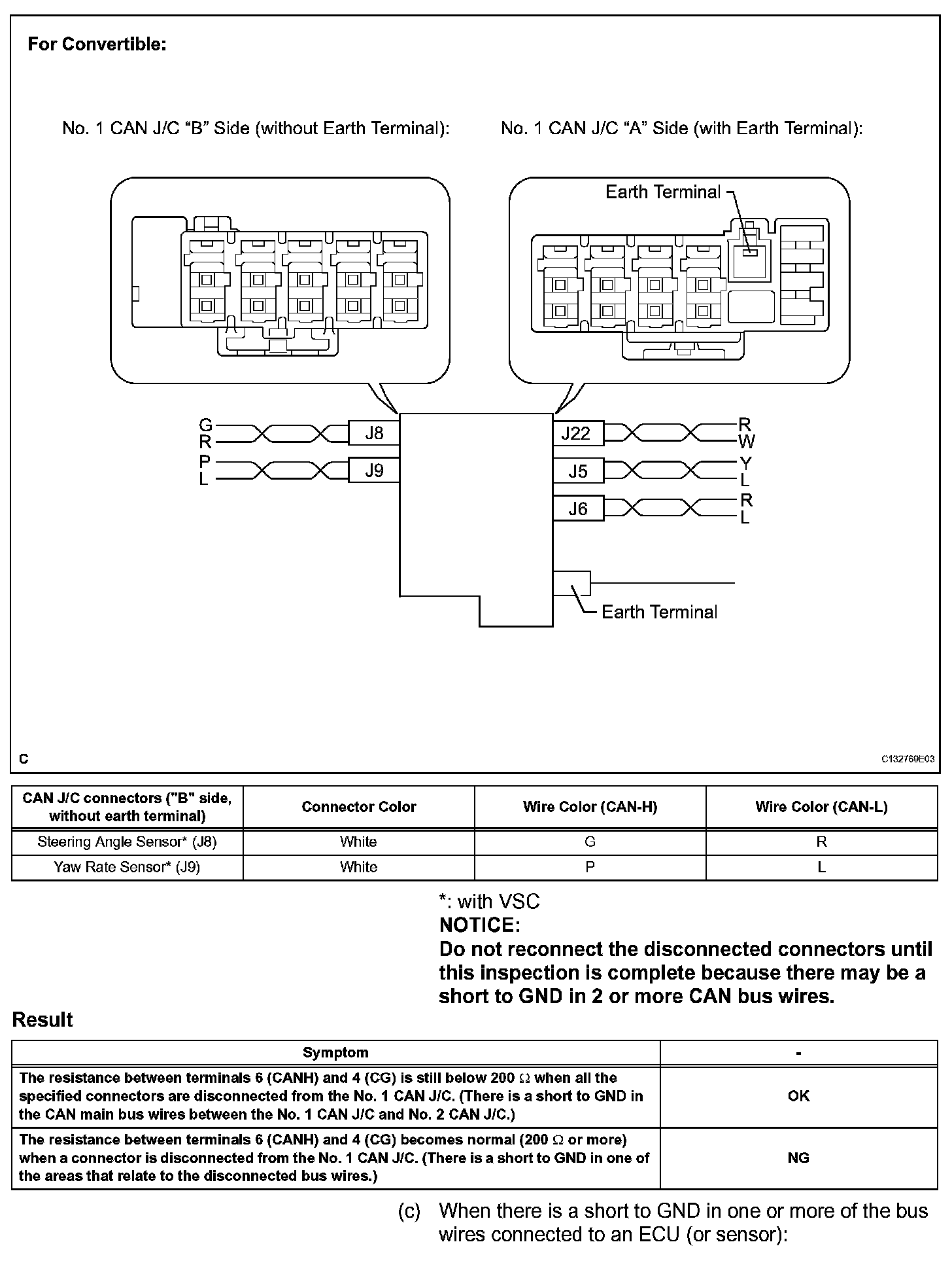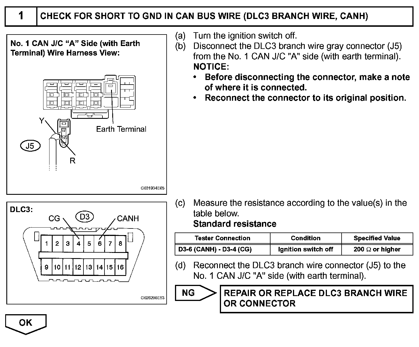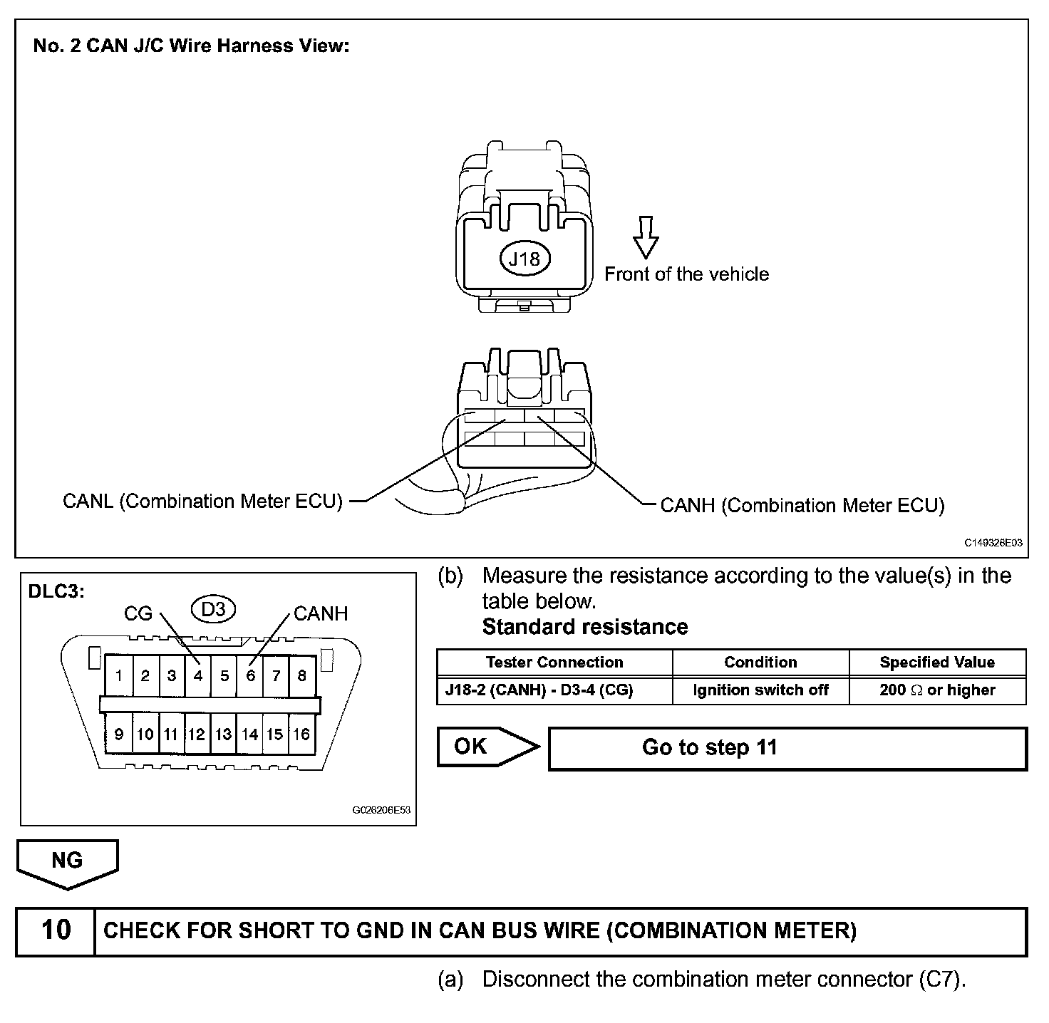 A short to GND is suspected in the CAN bus wire when the resistance between terminals 4 (CG) and 6 (CANH) of the DLC3 is below 200 ohms.