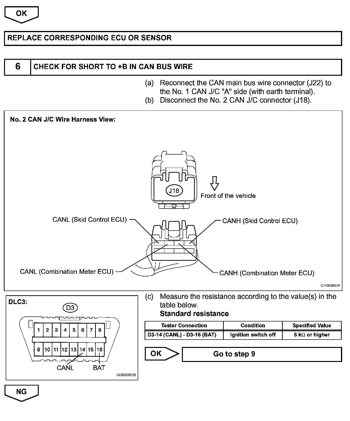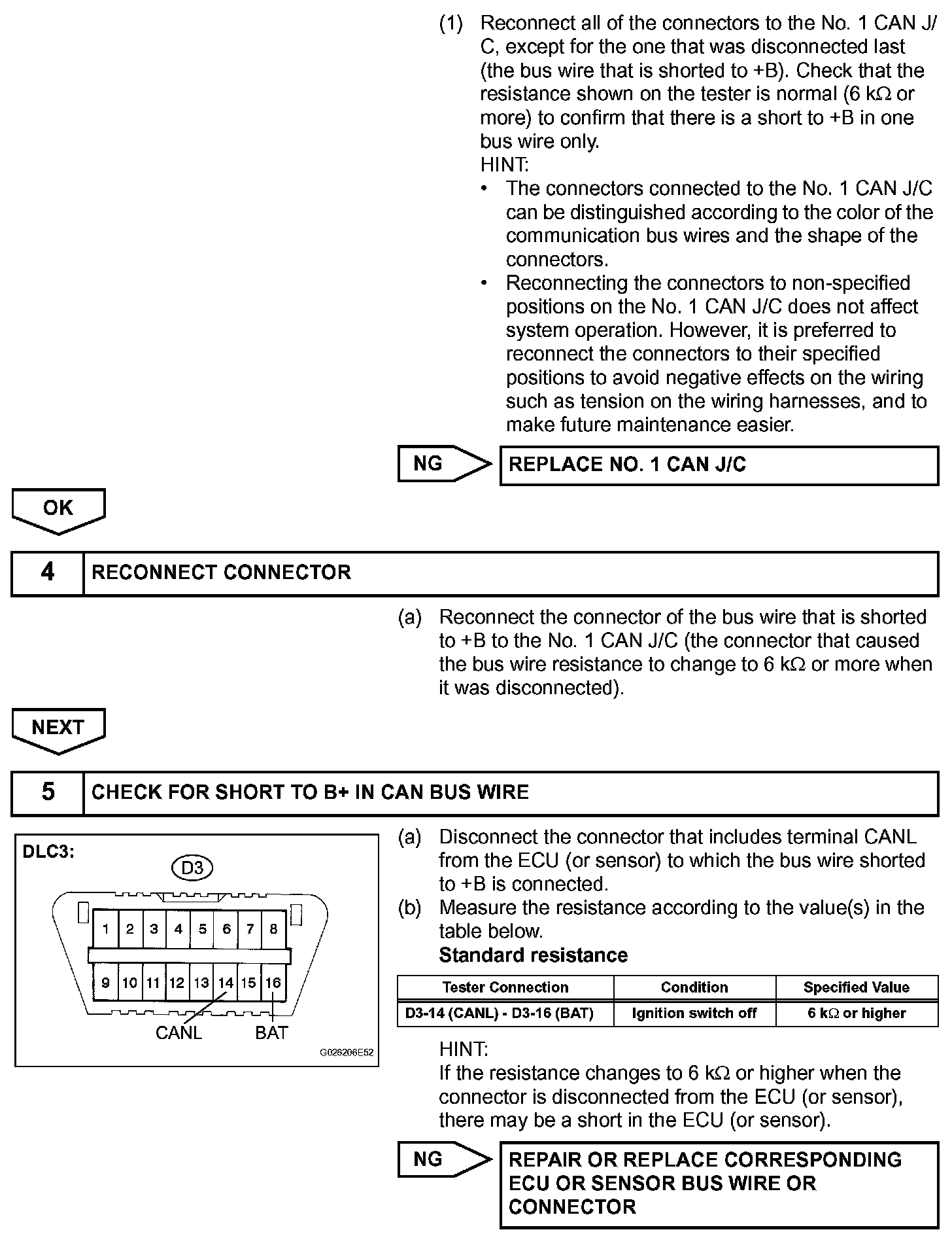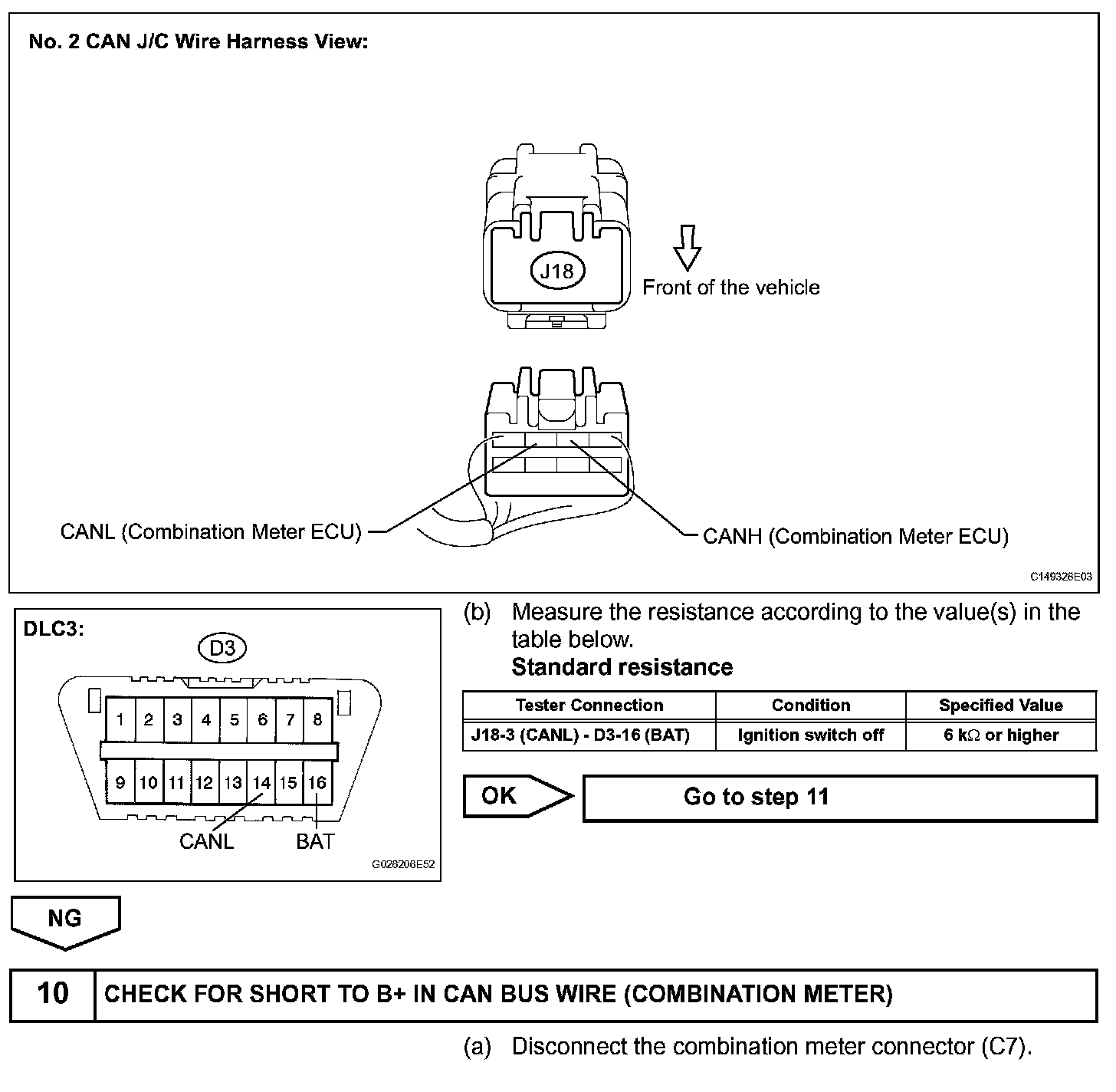 A short to +B is suspected in the CAN bus wire when the resistance between terminals 14 (CANL) and 16 (BAT) of the DLC3 is below 6 kohms.