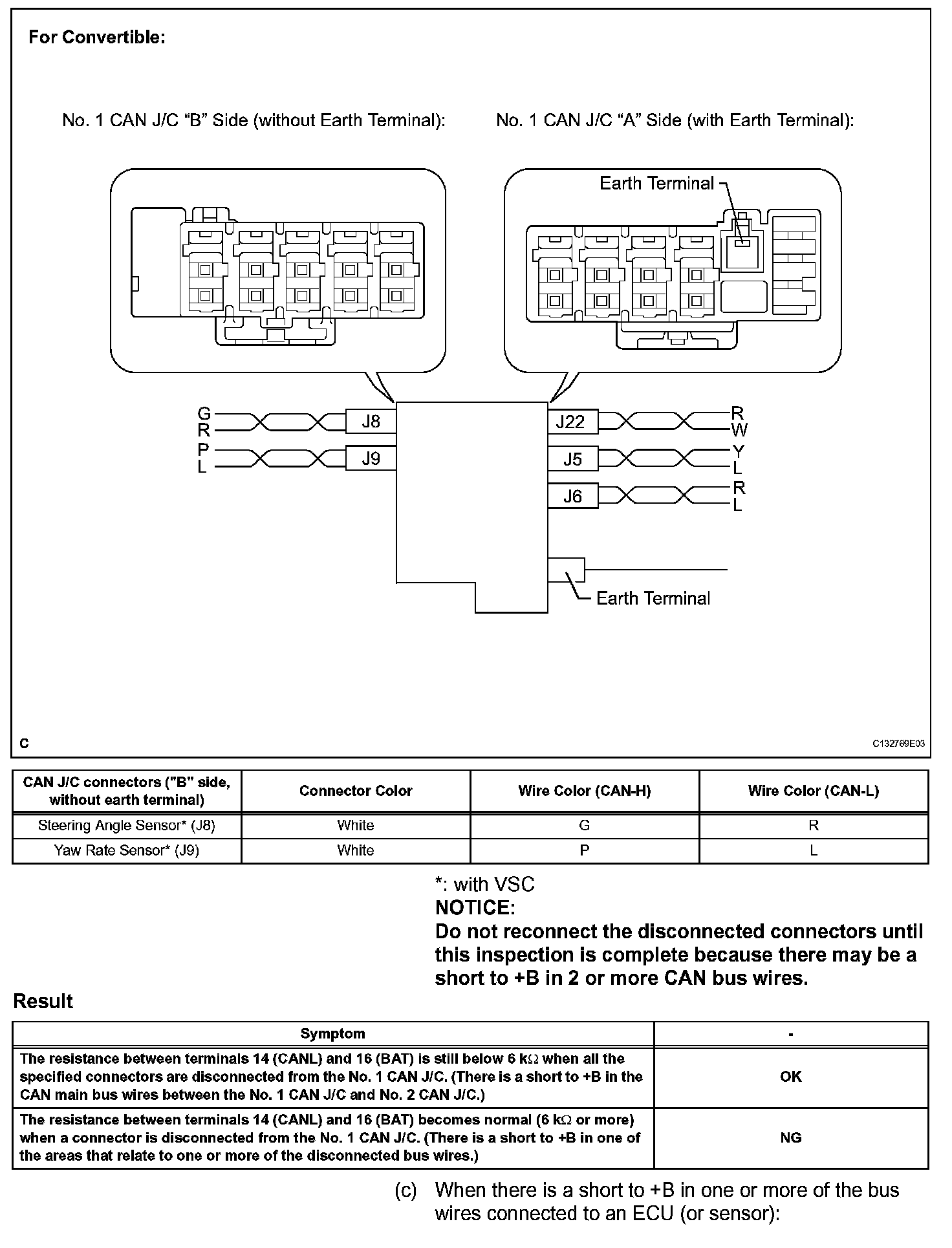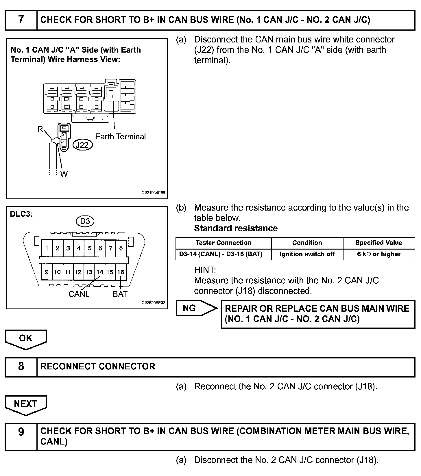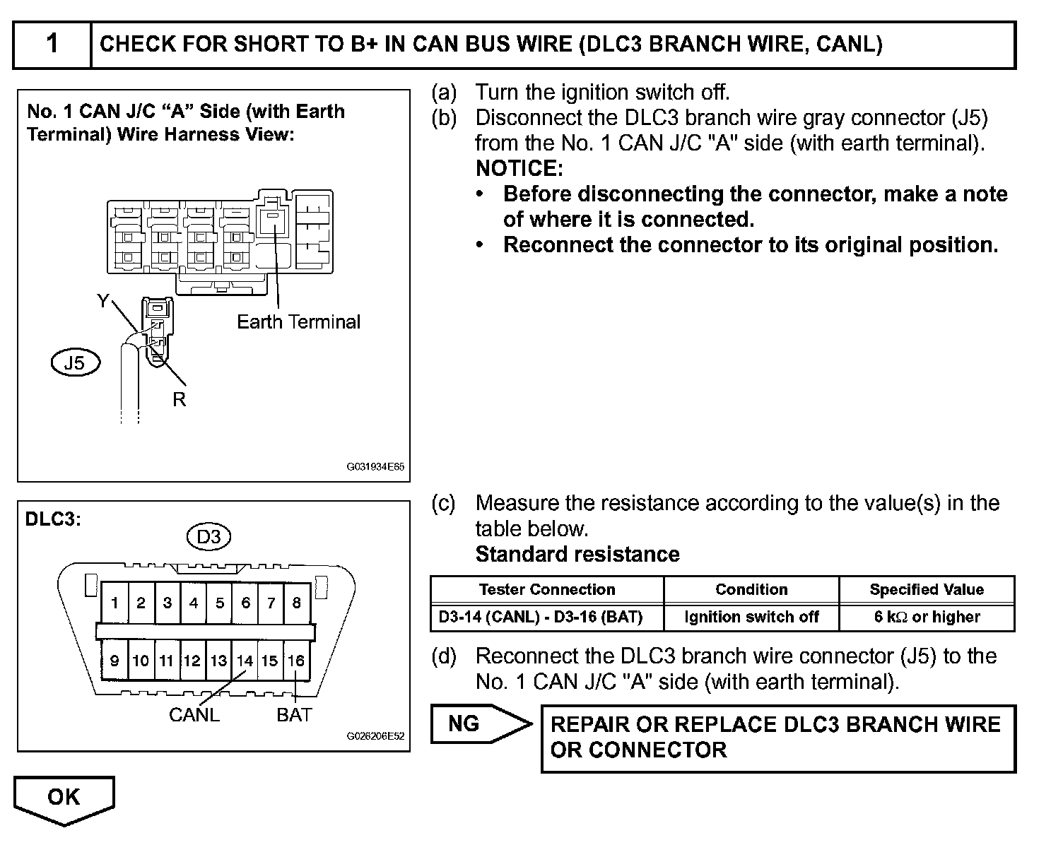 A short to +B is suspected in the CAN bus wire when the resistance between terminals 14 (CANL) and 16 (BAT) of the DLC3 is below 6 kohms.