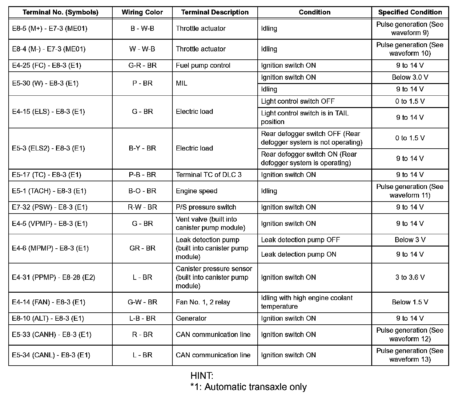 Pinout Values and Diagnostic Parameters