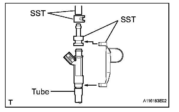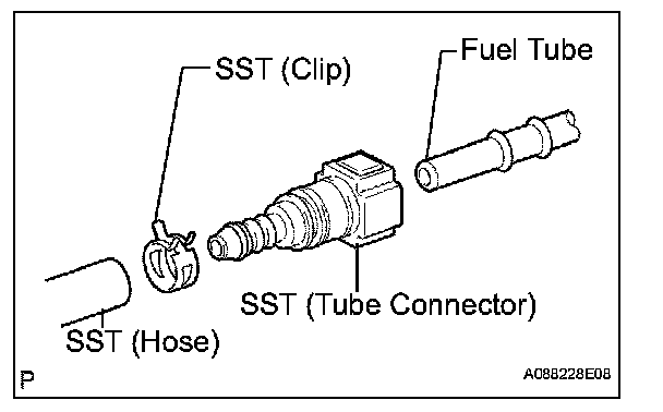 1. Connect SST (fuel tube connector) to SST (hose), then connect them to the fuel pipe (vehicle side).