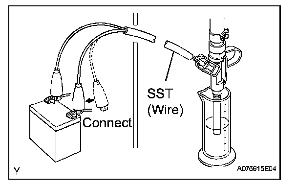 6. Connect SST (wire) to the injector and the battery for 15 seconds, and measure the injection volume with the graduated cylinder. Test each injector 2 or 3 times.