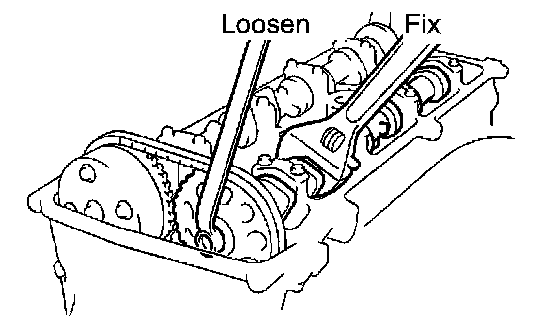 (1) Fix the camshaft with a wrench and then loosen the sprocket bolt.
