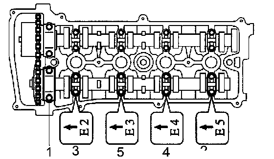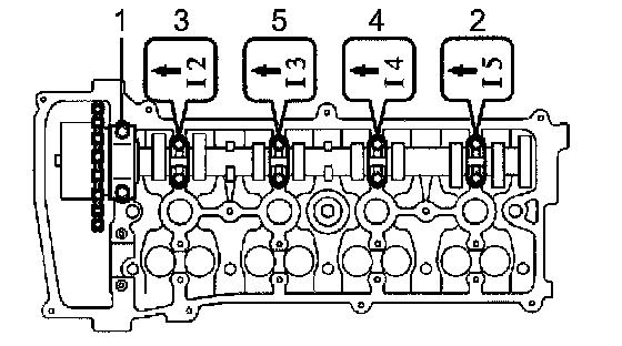 (1) Uniformly loosen and remove the camshaft's 10 bearing cap bolts in the sequence shown in the illustration. Then remove the 5 bearing caps.