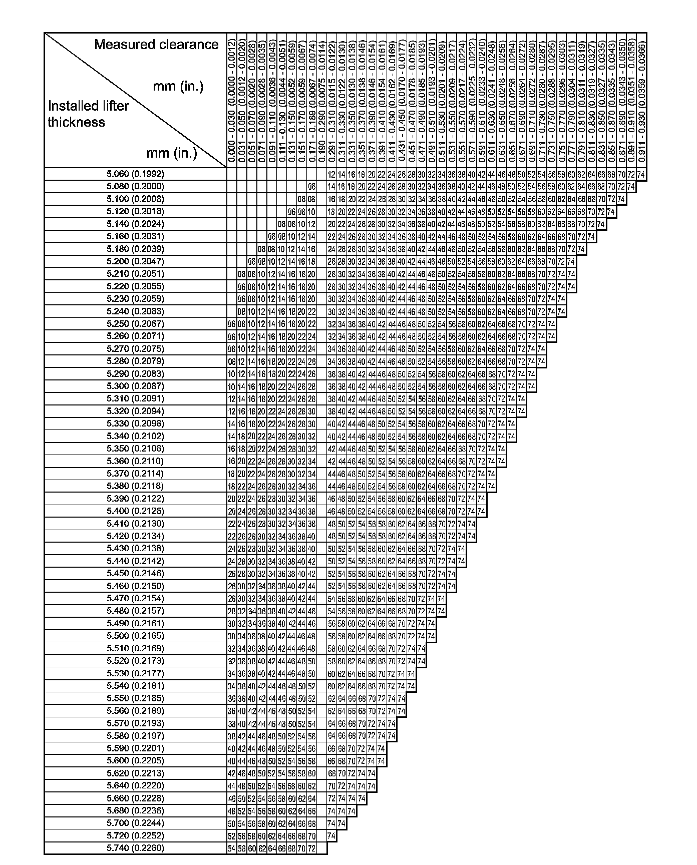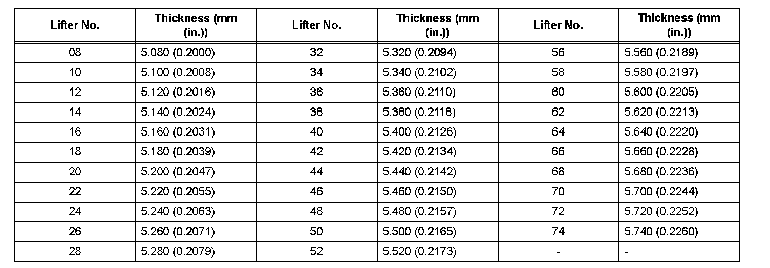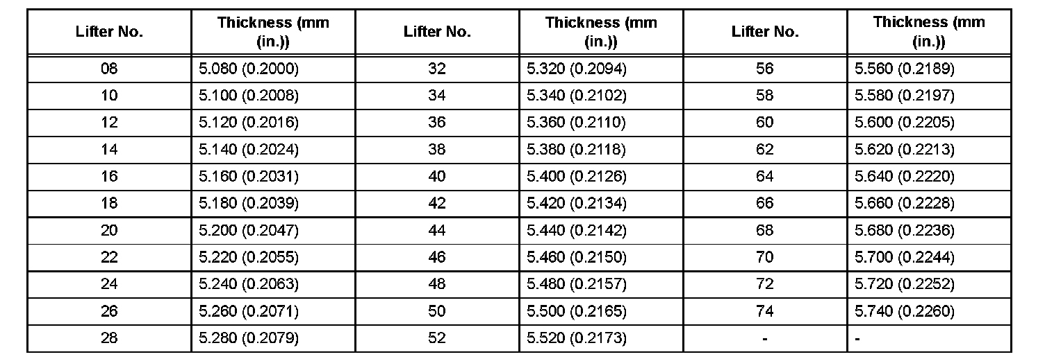 ^ Lifters are available in 35 sizes in increments of 0.020 mm (0.0008 inch), from 5.060 mm (0.1992 inch) to 5.740 mm (0.2260 inch).