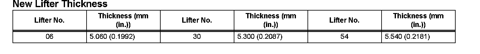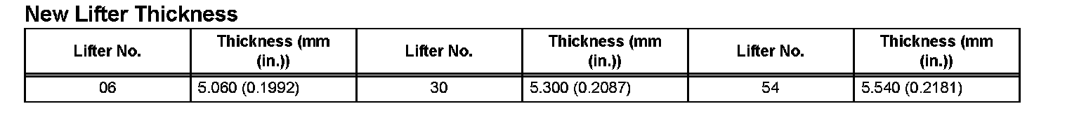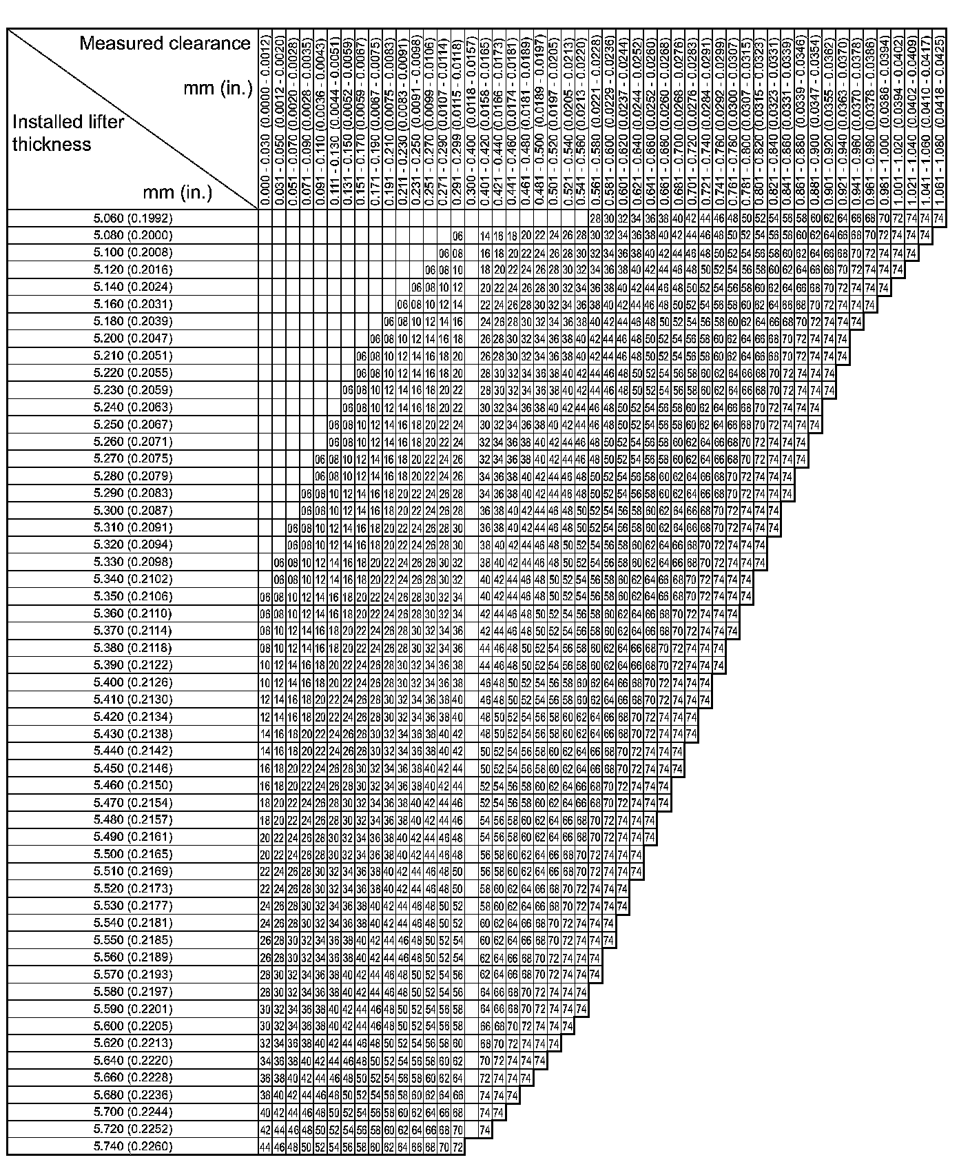 EXAMPLE: The 5.340 mm (0.2102 inch) lifter is installed, and the measured clearance is 0.440 mm (0.0173 inch). Replace the 5.340 mm (0.2102 inch) lifter with a new No.44 lifter.