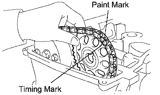 (1) Install the timing chain on the camshaft timing gear, with the paint mark aligned with the timing marks on the camshaft timing gear.