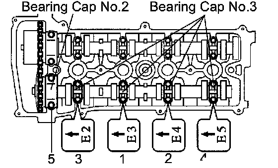 (2) Uniformly loosen and remove the No.2 camshaft's 10 bearing cap bolts in the sequence shown in the illustration. Then remove the 5 bearing caps.