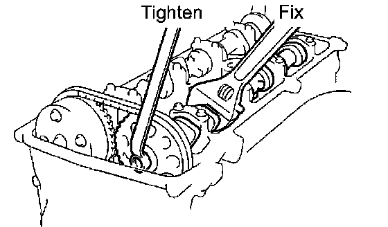 (4) Fix the camshaft with a wrench, then tighten the sprocket bolt.