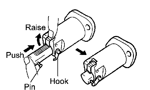 (1) Raise the ratchet pawl, fully push in the plunger and apply the hook to the pin so that the plunger cannot spring out.