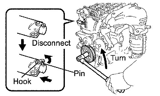 (3) Turn the crankshaft counterclockwise, and disconnect the plunger knock pin from the hook.