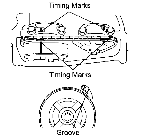 (b) Check that the timing marks of the camshaft timing gear and sprocket are aligned with the timing marks of bearing caps No.1 and No.2, as shown in the illustration.