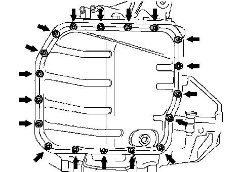 Transmission PanUsing a new gasket, install the oil pan with the 18 bolts to the transaxle case.