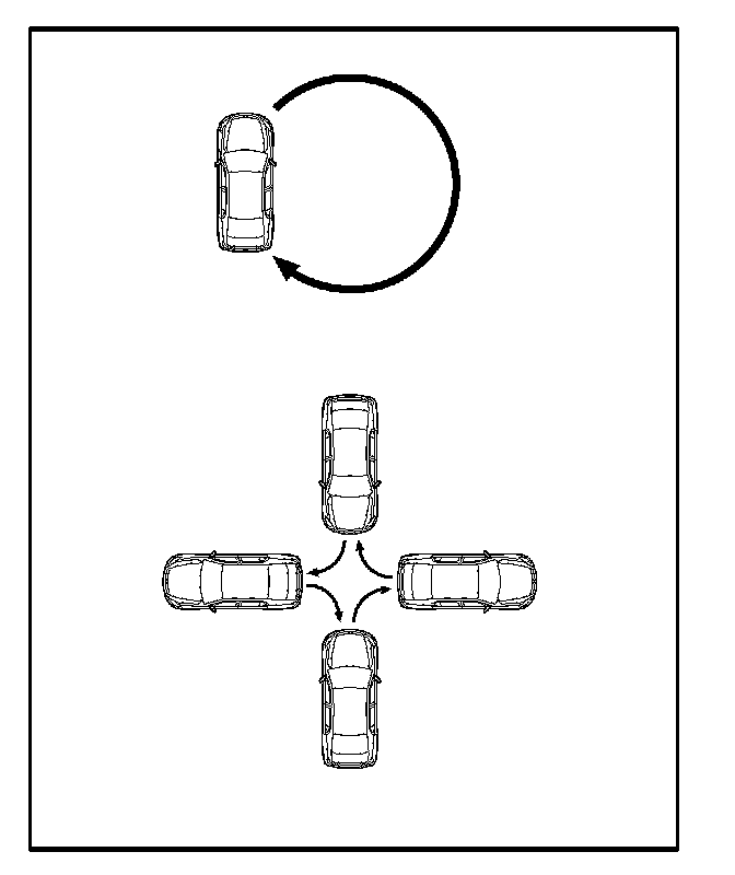 4. Drive the vehicle slowly at 5 mph (8 km/h), or less, in a circle until the direction is displayed. If there is NOT enough space to drive in a circle, turn the car around as shown, doing two 3-point turns in succession.