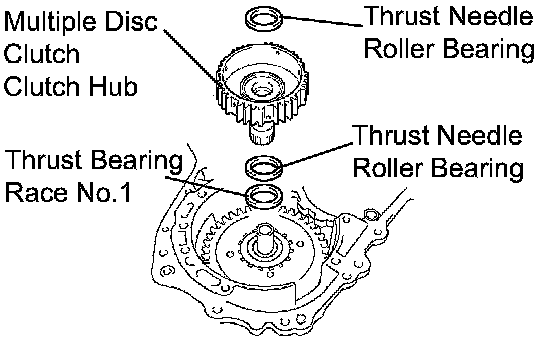 (a) Remove the thrust needle roller bearing, multiple disc clutch clutch hub, thrust needle roller bearing and thrust bearing race No.1 from the transaxle case.