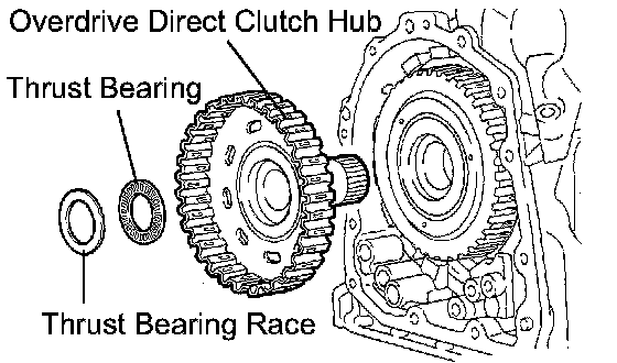 (a) Remove the thrust bearing race, thrust bearing and overdrive direct clutch hub from the planetary gear assembly.