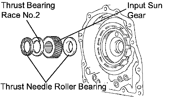 (a) Remove the 2 thrust needle roller bearings, thrust bearing race No.2 and input sun gear from the transaxle case.