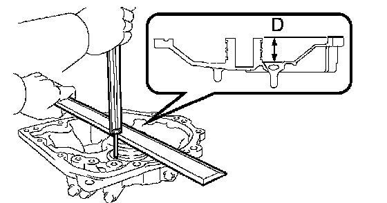 (d) As shown in the illustration, place a straight edge on the direct clutch drum and measure the distance between transaxle case and the straight edge using vernier calipers (Dimension C).