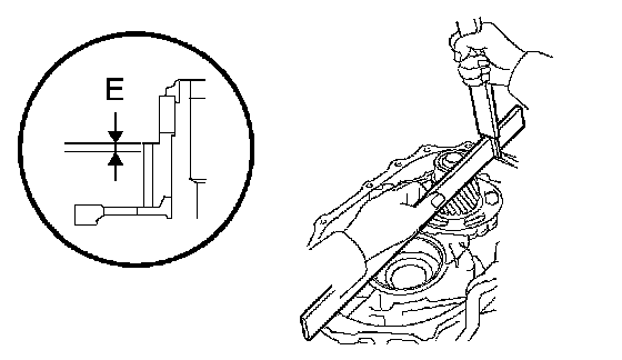 (d) Using a straight edge and vernier calipers as shown in the illustration, measure the gap between the top of the differential drive pinion in the underdrive planetary gear and contact surface of the transaxle case and housing (Dimension E).