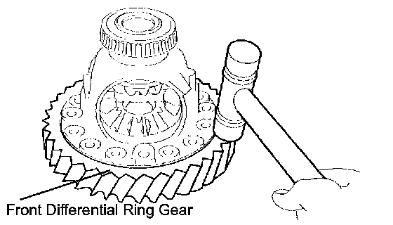 (c) Using a plastic hammer, tap on the front differential ring gear to remove it from the case.