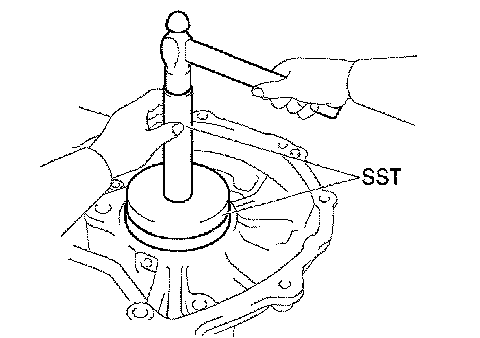 (b) Using SST and a hammer, install the front differential case tapered roller bearing front outer race to the transaxle housing.