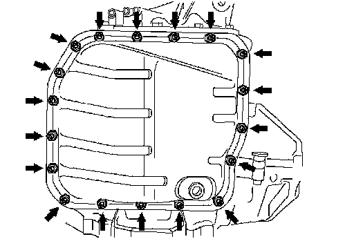 NOTICE: Some fluid will remain in the oil pan. Remove all the pan bolts, and carefully remove the oil pan assembly.