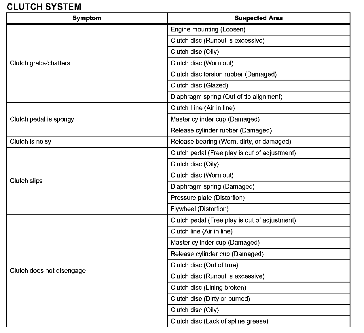CLUTCH SYSTEMPROBLEM SYMPTOMS TABLE